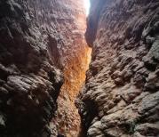 库车大峡谷,大峡谷近似呈南北弧形走向,开口处稍弯向东南,末端微向东北弯曲,由主谷和七条支谷组成,全长5000多米,谷端至谷口处自然落差200米以上,谷底最宽53米,最窄处0.4米,仅容一人低头弯躯侧身通过。谷侧奇峰嶙峋,争相崛起;峰峦叠嶂,劈地摩天,崖奇石峭,磅礴神奇;神洞秘窟,各蕴其意。谷内蜿蜒曲折,峰回路转;步步有景,举目成趣;泉水叮咚,鸟叫蝉鸣,寒暑不浸,游人称绝。整个峡谷犹如一条尾震天山头,口饮库河流(开口于库车河),曲身九十九的巨龙劈山而卧,呼风唤雨,神秘莫测。更令人称奇的是,距谷口1400米深处,高约35米的崖壁上,有一始建于盛唐时期,壁画丹青的千佛洞遗址,就文字记载和绘画艺术而言