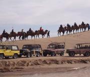 额济纳胡杨林的八道桥与其他几道桥不同,是没有胡杨树的,只有沙丘和湖,这个地方风很大,风一吹细小的沙子是扑面而来,所以口罩和墨镜是必须品(不戴口罩会一口沙子,原来在沙漠墨镜除了挡紫外线还可以用来挡沙子哦[坏笑])。这里有骑骆驼和机动车辆冲沙项目玩,蛮不错的,还可以看到大漠深处的黄昏日落,很美