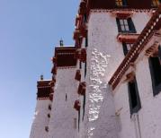 去布达拉宫的时候,一大早就过去排队,还只是淡季,太阳刚升起的时候队伍就已经从门口排到了大马路上,队伍里睡眼朦胧的游客,也有手持佛珠的藏民们。广场上的白鸽在布宫顶上盘旋飞过,阳光从东面一点点位移,最后把整座布宫都照亮。 最中间的红色建筑是红宫,主要为佛殿及历代达赖喇嘛灵塔殿,包围着它的则是一群白色建筑,为达赖喇嘛居住的部分。统一花岗石的墙身,据说这墙身有牛奶的成分。红宫内部比较昏暗,印象最深的是一座五世达赖灵塔殿,足有5层楼高,塔身以黄金包裹,达11.9万两之多黄金,也就是3721公斤黄金!非常华丽,并且镶嵌着许多珠玉玛瑙。塔身里放置着五世达赖喇嘛肉身。 藏民们转红宫的时候也都会一路诵着经文,在