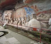 大足石刻堪与敦煌、云冈、龙门、麦积并称的艺术瑰宝,是南方最大也是艺术成就最高的石窟石刻群,以宝顶山为中心,以佛教造像为主,兼融儒道,所有造像都充满了艺术的灵动和连贯的故事趣味,风格独特,与其它石窟迥异。