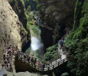 随团午饭后抵达龙水峡地缝景区,参观喀斯特地貌岩溶地缝奇观。 龙水峡地缝可以不需要导游讲解,自己可以步行进入,感受大自然的鬼斧神工,游览时间约2小时。 龙水峡是羊水峡谷上的最后一段,峡谷深度宽度之比接近20:1,属于地缝式喀斯特峡谷,构成一线天的景观。 升降梯直达峡谷中部,再穿过狭窄的人工栈道一直往下走,进入地缝。身在谷底,仰视天小,80米飞流直下的瀑布,清凉之气沁人心脾,暑热尽消;徜徉在谷中:绝壁、裂点、浅滩、泉水、洞穴等多种地质遗迹尽收眼底。观赏泉水流瀑挂壁,原始植被,峡深壁立,抬眼望一线天光宛若月耳,真是一幅绝美的山水图画。 景区部分路段地面湿滑,道路狭窄,一定要注意安全!谷深可是有200