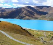 西藏三大圣湖之一。 羊卓雍措,藏语意为“天鹅池”,是西藏三大圣湖之一,也称羊卓雍湖(当地人通常简称为“羊湖”),因为藏语“措”就是“湖”的意思。地理上属于山南地区的浪卡子县。湖面海拔4441米,湖岸线总长250千米,总面积638平方千米,湖水均深20-40米,是喜马拉雅山北麓最大的内陆湖。羊湖岔口较多,像珊瑚枝一样,因此它在藏语中又被称为“上面的珊瑚湖”。 湖内分布有10余个小岛,大的可容五六户居住,小的则仅有百余平方米。湖中盛产细鳞鱼、西藏裂尻鱼、高原裸鲤等。这里还是藏南最大的水鸟栖息地,每逢冬季群鸟南徙至此,在湖岸及湖心岛一带,天鹅、水鸽、黄鸭、鱼鹰以及斑头雁都非常多。 羊卓雍措远观比近触