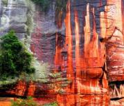 二游赤水丹霞风景区主景赤水大瀑布,书《红岩绿树拉巨屏》瀑布高宽八十米,丹霞瀑布第一名。赤水丹霞六瀑布,十丈瀑布最有声,卅丈瀑布映丹霞,奇险秀美吼雷声,冲倒老君炼丹炉,炼丹之处红崖生,气势磅礴从天降,青山赤壁丹霞魂,银瀑飞泻天公造,红岩绿树拉巨屏。彩虹飞驾套光环,再游丹霞二十景。