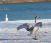 平陆县三湾大天鹅景区位于山西、河南两省交界处,属于三门峡黄河库区内,近年来,随着平陆黄河湿地生态环境不断改善,每年到此越冬的大天鹅数量已经超过一万只。为了能给大天鹅提供足够的越冬食物,当地群众在黄河湿地里种植了一些黄豆,为大天鹅觅食提供便利