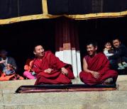 色拉寺每天下午三点开始辩经。我在院子里等到三点,僧人们三三两两的来了。这是一个独立的小院子,地上铺满碎石,院子里有很多树,高原的阳光透过树枝洒在院子里,把院子弄得斑驳陆离的。喇嘛们有的站在树下,有的倚墙而立。人越来越多,说话的声音也大了起来。辩经开始了,他们有的是一对一的,有的是一个人对两三个人的。我听不懂他们的语言,只是知道他们是在就佛经里的一些东西在阐述自己的观点。他们非常专注认真,大声的辩论着,加上夸张、激烈的肢体动作,击掌、跺脚,根本不理会我的镜头。偶尔看到你在对他拍照,也只是看你一眼,就又投入到他的世界里去了。