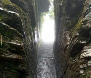 进入梵净山景区,停车场很大,先去游客中心自助取票。票上有接驳车排队号码,等了三个半小时,终于坐上接驳车。山里山弯里湾,到了索道站,缆车程十余分钟,尽情饱览梵净山脉的丛山峻岭苍翠绿植。开始步行登山,先往蘑菇石和老金顶方向。看到蘑菇石的刹那,不得不感叹大自然的造化之神奇!两块页岩石如此巧妙的上下组合,真的是鬼斧神工啊!一路登山看到的尽是页岩石,仿佛是网红蛋糕巧克力千层。继续前往老金顶,有一段山路较险峻,只容一人通过,两边是陡峭的山石还滴着水,台阶都被磨的精光。登上老金顶,海拔2494米,有个燃灯殿,正所谓“无限风光在险峰”,站在老金顶,看脚下群山连绵,云雾缭绕就在身边穿梭,看对面红云金顶若隐若现,