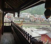 非常有特色的丹巴甲居藏族民居,建筑运用红白黑色,依山而建,配上蓝天白云,金黄的玉米,满树苹果梨子,非常美。对面有座高山,有房屋建在很高很高的山上,大家都很好奇怎么上下。如果能在里面住,就能好好欣赏室内的装饰,我们看到一户正在修的房子,真是雕梁画栋,太讲究了。不住的话只能在路上走走,看看外观。