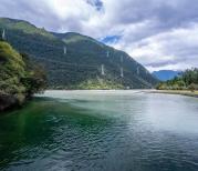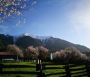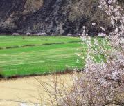 进入岗乡自然保护区, 这里是云衫林区,有较多的客栈。这是因为岗乡有着一处光线美妙的地方,在索朗家庭旅馆的前面,道路的右边,一片绿色青稞田,几株粉红色的桃花树点缀其间,北面是雪峰