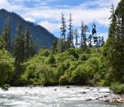 尼洋河河水常年清澈见底,碧绿的河水被蓝天映的蔚蓝,河边一条公路相伴,沿途河堤边桃花盛开,还有不时出现的牛羊和低头觅食打盹的大小黑猪; 沿着公路一路向上,阳光渐渐漫过远处山头的桃花林,绿的红的光的影的半明半昧。
