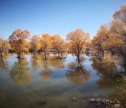 金塔胡杨林都美,不仅仅在于金灿灿的胡杨树,最主要的在于他的水,可以看到蓝蓝的天、蓝蓝的水、金色的胡杨和金色的倒影,这个确实只有在金塔胡杨林才可以看到。