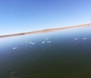 居延海这里真是太美了,湖面上倒映着蓝天白云、碧波荡漾,湖畔芦苇丛生,湖中生长着鱼儿,随处可见天鹅、大雁、仙鹤、水鸭在这里栖息。好美啊!