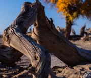 额济纳胡杨是一种奇特的树种,生命力极强。胡杨赖以生存的生态环境、特别是额济纳河断流,沿河两岸的大片胡杨林因缺水而枯死。胡杨特有的耐腐特性,使大片枯死的胡杨树干依然直立在戈壁荒漠之上,形成形态怪异的悲凉景观