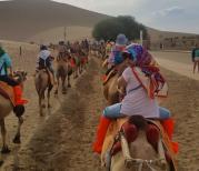 敦煌鸣沙山月牙泉,一个令人神往的神奇地方。位于敦煌市区南面,沙山高耸、泉水清冽。鸣沙山,顾名思义就是会发出声响的沙山,比如安静的环境下吹风的时候或者很多人一起滑沙的时候,由于沙粒的共鸣而发出的声音。沙山环抱中一泓月牙形的清泉古往今来从不干涸,也从不被流沙淹没。景区门口可以骑骆驼到达月牙泉,大概四五十分钟左右,暑期旅游旺季,景区游人非常的多,骆驼大军也是浩浩荡荡,不时扬起漫天沙尘,所以要注意防晒防尘。爬沙山的时候非常耗费体力,要带足水,不然爬到山上后没水喝是一件很痛苦的事情。