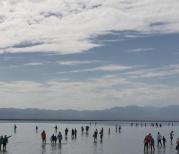 茶卡盐湖最美的是拍湖面的倒影,这完全要看天气了,如果连续几天都是晴天的话湖面镜面效应好,拍出来的照就好看、如果是阴天或下雨那就不咋样了。还有喜欢拍照的一定要穿颜色鲜艳的衣服去,红色和绿色的长裙最是漂亮,不过有些冷,不穿裙子腰里系上纱巾,或手里举上飘巾也很漂亮。盐湖是晒盐场,所以水很浅,我们都是脱了鞋进湖里拍的。景区小火车比较慢,我们等了好久才有一班车,差点迟到,所以赶时间的要早些排队乘车回去。