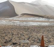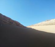进门之后就看到“鸣沙山月牙泉”字样,有零零散散的一些游客,他们往那里走,我就往那里走,开始时看到的都是沙漠,准确地说是沙山,有些白雪皑皑,有些一点白都没有,我时不时地对着山照相,向游客去的方向慢慢地走,的确弄不明白他们要去哪里,忍不住了,问一个在那里挖沙的人,她告诉我,他们去看月牙湖呀!月牙泉(湖)被山围着,往里才能看到,终于看到了精华所在——月牙泉以及月牙阁等等。游完才知道这是什么景点。看月牙泉是之一,爬鸣沙山是二,这沙山,爬起来会发出响声,由于天气太冷,我就不爬山了,但看到有人在爬。这是个5A景区,关于月牙泉有很多传说,游了就知道了。景区里面还有很多付费玩的项目——骑骆驼,骑摩托,坐直升机