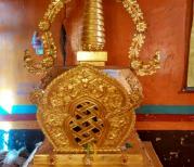 色达唯一的皇家寺庙——东嘎寺,它是藏区著名的红教寺庙,被列为东藏三大寺庙之一。 寺庙由曲锡吾金创建于公元1686年,坐落在一座形似白色海螺的神山上,殿堂内塑有释迦牟尼坐像一尊,三面绘有宗教壁画,红柱上雕龙刻花,色彩艳丽夺目,气氛庄重肃穆。