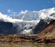 到米堆冰川时,看到了米堆冰川一角,被诱惑,买了门票就往里走,7公里,全土路,比较难走。到达停车场后,步行上山,这是第一次近距离看冰川,心里还是很激动的,加上冰川前小山丘上的树叶的黄绿相间的色彩,让冰川看起来格外漂亮。