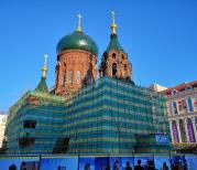 圣索菲亚教堂这里的交通也属于比较便利的,离开中央大街不远,不论是白天还是夜晚,大教堂总会带给大家迷人的色彩,个人感觉这里非常值得一去哦。 个人很喜欢这里的夜景,下次有机会一定要天冷下雪的时候来这里,雪景应该会更美哦。同时也很喜欢这里的蓝天白云,衬托着典型的古老的俄式建筑,非常的震撼。 维修中的索菲亚大教堂,估计要修到2019年8月31才能对外开放,感觉有些可惜了,下次一定还会再去一次。听当地人说,教堂里面展出了近千张的照片,清楚的记载了哈尔滨的昨天今天和明天。