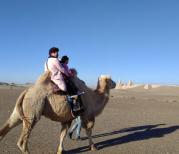敦煌鸣沙山票120。整体上还可以,感受下茫茫沙漠,一望无边,倾佩下古人丝绸之路的勇气!更能感受沙漠绿洲的美! 来这里装备得带齐。各种防晒装备是必须的,还建议提前准备好高帮鞋套,否则鞋里会全是沙子,脏了不说,也难受。也有人穿凉拖或光脚,不知什么感受,估计天热时肯定烫脚。里面提供租用的布鞋套15元一次,保护的不错,价格高了点。 里面有滑沙,摩托,滑翔伞,直升机等可玩,都要收费。 骆驼100块带你上山,5-6人组成一组。到山顶下来休息,可以玩滑沙等。下来自己爬了一段山才发现非常累,让我自己爬绝对会中途放弃。不过自己上山有专门的路线,有像梯子样的台阶,应该容易些。休息过后骑着原来的骆驼下山,带到月牙泉