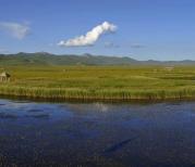 若尔盖花湖位于若尔盖县城以北35公里的热尔大坝草原,岸边芦苇茂密,因湖中盛开的一种白色小花而得名花湖。此外,这里还是观看国家一级保护动物黑颈鹤的最佳去处。花湖湖面辽阔,水下是深不可测的沼泽地,在阳光的照耀下,水面反射出不同的光彩,摄人心魄。