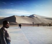 敦煌的当天下午就迫不及待地跑去鸣沙山景区外面打听有没有帐篷露营的活动,但结果让我们失望了,这种活动要在旺季才有,也只好等以后再说了!第二天早早吃过午饭进了景区,先骑个骆驼过过瘾,上沙山顶上溜达一圈看了看景色。山顶有些娱乐项目,沙漠越野车在新疆玩过两回,而且这儿越野的地势不如新疆崎岖刺激,不感兴趣没玩!滑沙项目又感觉沙坡太高太陡太长,担心这把老骨头老心肝又可能受不了,没敢玩!纠结的两个人只能再骑上骆驼下山了,途中看到居然还有人在天上玩滑翔机,听到传来的嘶嚎声不禁心中感叹:只有脚踏实地的动物才是人类的好朋友!下山后沿着沙山漫步,走到了最具浪漫色彩的月牙泉。各种年龄的情侣或夫妻都爱在这海枯之地秀一秀