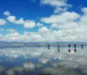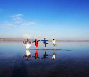 进入茶卡盐湖景区,映入我眼帘的是小火车,我们坐着小火车看到周围铺满了洁白的盐结晶,旁边还有巨大的盐山堆积,远处的湖面上洁白洁白的,不知道的人还以为是白茫茫的雪地呢?不一会儿我们来到了一个盐山,用盐堆起来的,我坐在一个巨大的盆子里就往下滑,听导游讲冬天它就是一个滑雪场。这里没有江南格调的小桥流水,也没有城市的喧闹,它很安静也很美,有一种海天相接的感觉,我们下了小火车,走在铺满盐的路上,犹如进入盐的世界,导游说还有一个可以游泳的地方,我惊奇坏了,也兴奋极了,迫不及待跳到湖水中,湖水很浅,但是漫过了我的膝盖,湖水很咸,这就是神奇的漂浮,因为盐湖的湖水中有很大的浮力,,人在水中不会沉下去,而是会轻轻松