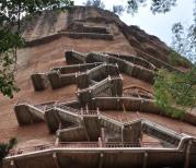 麦积山石窟,是中國的四大石窟之一,是全國重點文物保護單位,也是聞名世界的藝術寶庫。麥積山位於甘肅省天水市東南約三十五公里處,是我國秦嶺山脈西端小隴山中的一座奇峰,海拔1742米,山的形狀奇特,猶如麥垛,因而被稱為麥積山。麥積山石窟,坐落於一座圓如麥垛的紅色獨峰中。在距山基20—30米、高70—80米的懸崖峭壁上,歷代開窟造像,層層疊疊,上下錯落,密如蜂房。唐代開元年間地震,崖面中間塌毀,石窟群分成東西兩崖。現存北魏、西魏、北周、隋、唐、五代、宋、元、明、清等歷代洞窟194個,泥塑像、石窟像7000餘身,以及壁畫1300多平方米。麥積山石窟,主要以其精細優美的泥塑著稱,被譽為“東方雕塑館”。