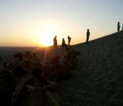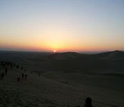 我们的导游是一个很兢业的导游,为了让我们上敦煌鸣沙山看日出,她做了充分的备案。我们清晨四点半起床,天色还是很黑很黑的,赶到景点,朦朦胧胧、隐隐约约的人群,乌呀呀的一片,导游买好票,景区门口,脚上套上防沙套,骑在骆驼背上,跟随着浩浩荡荡骆驼队向鸣沙山上山看日出的制高点前行,到达目的地,大家静静的太阳升起……不一会儿一片红晕从东边泛起,太阳缓缓的从东边的地平线升起、跳跃而出,观日出的人群要雀跃、欢呼!
