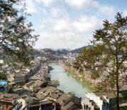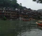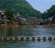 沱江泛舟就在跳岩旁边,这是凤凰的经典景点,必看。从跳岩上踩着青石块过江,脚下是湍急的江水流过,还是很刺激的。我因眼神不好,有些战兢。这里也是拍照的绝佳地点。