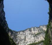 小寨天坑风景区位于距奉节县城91公里的荆竹乡,天坑坑深666米,是目前世界最深的天坑。从坑口沿着峭壁上的台阶,步行下到坑底,一路欣赏自然风光及坑壁上的小瀑布。途中有两级台地:位于300米深处的一级台地,台地上有农家可以休息;另一级台地位于400米深处,坡地上草木丛生,有小路通向坑底。坑底有路通往观景台,在这里仰望,可以深深的感受到“坐井观天”的含义。世界最大天坑,楼梯爬得我直不起腰,估计有三千多档,景色还是不错的,空气也好,坑底比较潮湿。地缝也玩的比较有趣味,缝底好像是乱石岗,又像一线天,各种石头形状不一。