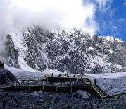 玉龙雪山: 坐索道上山途中,周围是长年不化的积雪,巨大的岩石和茂密的冷杉树林。到了4506米的索道终点站,我的眼前是一片白皑皑的积雪,就象来到了冰雪王国。玉龙雪山有十三个峰,犹如一条腾飞的巨龙,直插蓝天,万里无云,雪峰以蓝天为背景就象一幅美不胜收的画卷。这里的海拔地势高,人容易缺氧,引起高原反应,所以只能慢走,不能跑、跳,不能兴奋地大喊大叫,如有不舒服的时候就吸口氧。
