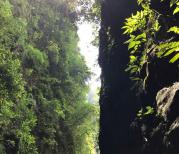 到龙水峡是中午12点,杂货铺里买了随身装萨其玛和瓜子花生,溜达进入景区,走过狭长台阶隧道、乘电梯向下深入;周围的绿色和湿气,纷飞的雨线,构成立体画面。出景区路旁是商贩明码标价的蒸制、炸制食品;总体游览时间2小时,游览的很清净,没有熙熙攘攘的人流。
