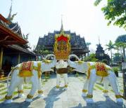 傣族园里面有西双版纳最古老的,1400多年历史的曼松满古佛寺,和非常有特色的勐罕曼听佛塔寺塔包菩提树。千年曼春满古佛寺,是傣族人的信仰,南传上座部佛教文化的传承地之一,虔诚的傣家人全民信佛,每当特定的日子,傣家人都会早早的到寺庙里祈福。