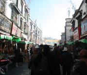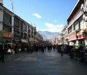 八廓街,在游人眼中这条街为商品街,而在藏族人眼里却另有含意,它是藏族传统的转经之路。拉萨传统的转经路有三条,沿大昭寺大殿一周为小转,沿八角街一圈为中转,沿林廓路一绕为大转(约十公里),此三条转经路,都以释迦牟尼像为中心。