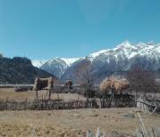 午饭后车程半个小时就来到米堆村子(位于八宿县然乌镇与波密县城之间),然后下车徒步1个小时去,一路见到肥沃更低茂密森林,原木搭建的西藏屋子大多是2层,有晒台,晒台上支起木杆搭满上年收货的额麦秆和青稞杆,每家院子想农场,长有高大乔木,树旁插有风马旗,随风飘扬,置身这样一个森林公园心神游离,离天堂真的好近。冰川、湖泊、农田、村庄、森立融汇一起,一派人余自然和谐画面。