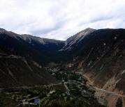 翻越觉巴山,完全是沿着山坡呈之字形盘山而上,一座山接一座山。突然眼睛一亮,山高谷深中出现了一抹绿色,如翡翠般镶嵌在山坳了,给疲惫不堪的我们带来了视觉上的享受。