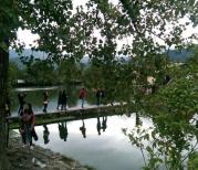 南湖位于宏村南首,是宏村旅游主要的景点,建于明万历丁未年(1607年),宏村村落经永乐年间到万历年间,楼舍连栋,高低错落,人口繁衍,光靠月塘蓄水已不够用,又在万历年丁末年将村南百亩良田,凿深数丈,周围四旁砌石立岸,仿西湖平湖秋月式样,建成南湖。湖成大弓形,湖堤分上下层,上层宽4米,原来古树参天,苍翠欲滴,躯干青藤盘绕,禽鸟鸣唱,还有垂柳,枝叶婀娜,像临镜梳妆的少女,把秀发洒向湖面水中。湖面绿荷摇曳,鸭群戏水,另有一番景致。整个湖面倒影浮光,水天一色,远峰近宅,跌落湖中,加之树荫水深和日光的相互作用,明暗协调,动静相宜,显得幽深、雅静、清新、明丽。南湖历史上大修三次,1986年重建中堤,造&am