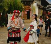 白沙古镇至今仍然保存着质朴的纳西底色和原始生态。古城里随处可见穿着民族服装的纳西族老妇。牌楼的门匾上依然清晰可见“世界文化遗产纳西古王国之都——白沙”的字样,而透过门牌,便是遥遥相对的雪山。