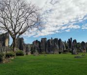 石林位于昆明市东,是世界罕见的风景名胜,是大自然鬼斧神工杰作。在广达400平方公里的区域内,遍布着上百个黑色大森林一般的巨石群。有的独立成景,有的纵横交错,连成一片,占地数十亩。只见奇石拔地而起,参差峥嵘,千姿百态,巧夺天工,被人们誉为“天下第一奇观”。
