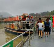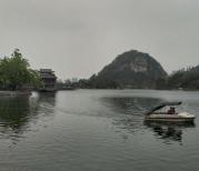 在网上买了丹霞山的门票,游完长老峰返回到阳元村快响午了,决定先坐游船:趁这个时候游客不多也正好可以放松一下。在窗口把订单号的短信给工作人员看,很方便地买到票。由于近中午客人不多,没怎么排队就上了船。是小游艇,我们坐在最后面有些晃发动机吵但视野开阔、照相更方便(小孩不爽想坐大船)。船一路开过去,转了一圈来回近一个小时。舵手兼导游给我们作介绍这个象啥那个是啥的,由于阴天只能雾里看花