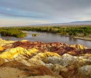 布尔津五彩滩是一个有着神奇地貌的地方,它的特别之处在于一条河流的两边竟然完全不同,一边是郁郁葱葱的小树林,一边是色彩斑斓的岩石,太神奇了!