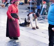 矗立于八廓街, 眼泪不停地往下流, 游人投来异样的眼光, 匆匆路过的游人只是在不停地拍风景和自拍。 我就一直站在玛吉阿米的十字路口, 看着这群朝圣的人, 我什么都没说, 不知道为什么就落泪了, 好多年没有这样哭过了。 可能是因为难以有事触及灵魂了。 我可以不知道自己喜欢什么, 但我一定知道自己不喜欢什么。 看着落寞地两个残疾的朝圣者, 心里有痛楚和同情, 我自认为自己是一个“铁石心肠”的人, 重来不给乞讨者钱。 今天我“大方”地一人给了他们十元钱, 虽然钱不多, 但总觉得有种救赎了自己的感觉。 心里更有无尽地佩服, 看着最后一图那一位只剩一只脚的朝圣者在夕阳下孤独的背影和拉长的影子, 我相信了