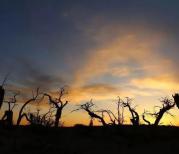 每年深秋,额济纳河沿岸一片金黄,层林尽染、神态万般。阳光照射下的金色树叶,映衬着湛蓝的天空,在风中婆娑起舞。落日余晖中,千年不朽的胡杨树,在夕阳下张牙舞爪、光怪陆离,让人心碎。