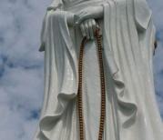 南山海上观音[1]圣像高108米,凌波伫立在直径120米的海上金刚洲(观音岛)上。像体为正观音的一体化三尊造型,宝相庄严,脚踏一百零八瓣莲花宝座,莲花座下为金刚台,金刚台内是面积达15000平方米的圆通宝殿。