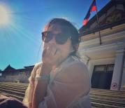 进入王宫博物馆要脱鞋,储物柜不多,什么东西都不让带,储物柜房间的大叔态度很差,问他平板里面有孤独星球需要看简介能不能带进去,他不耐烦地让我们看墙上的说明,就是不让带。手机我看到有人偷偷带进去,单反就太大了。闪光灯对文物是有伤害的,尤其是对有机质文物,而且一旦有一个人闪了一下,就会有一大堆人跟风,控制不住,所以不带是应该的。所以只能拍个门口。里头格局应该就是国王住的地方,议事厅,接待室,卧房书房,老挝国王应该比中国皇帝简朴。还有一些各国送来的礼物,中国很多。有一点,议事厅挺漂亮的,金碧辉煌,但是老挝人也就喜欢用彩色玻璃拼贴出闪闪发亮的效果,并不是真金白银那么珍贵的东西