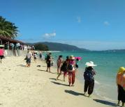 去了亚龙湾热带森林公园后再去亚龙湾海滨,海滩相当不错,慰蓝的天空和清沏的海水形成海天一色,游人如织,相当火曝。风景真的很美,沙子很细很白,不是那种粗黄的沙子,海水也很清。可能是我去的时候还不是很多人,不会显得太拥挤。在那里度假的确很能放松身心。