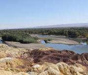 五彩滩风景区前还有大型的风力发电网站,给辽阔的视野里添加了一曲动感活力的生命旋律。绿草如茵、山花烂漫、牛养成群、骏马奔驰,绿洲与沙漠之间穿插着群群的骆驼,大场面的景观更体现哈萨克牧民纯情,朴实的牧民生活,让您感受到一路春风一路歌声。 北岸它是悬崖式的雅丹地貌,山势起伏、颜色多变,其是由激猛的流河侵蚀切割以及狂风侵蚀作用而共同形成。