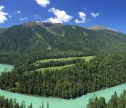 俯瞰喀纳斯湖必须登临观鱼台,山顶景色很好,还可以看到雪山顶白雪覆盖。喀纳斯湖水的中央湖,据说在不同的季节会呈现不同的颜色,真的很奇妙,值得一看。