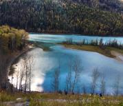 卧龙湾是喀纳斯河的一段河湾,位于著名的月亮湾和神仙湾的中间,也是水面最开阔的一段。因为河中一个小岛形似恐龙而得名,枯水期尤其明显。
