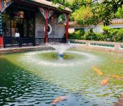 南海影视城的每个建筑都与池塘相连,形成处处是景的格局。池塘里养满了红鲤鱼和乌龟,很有趣味。不走寻常路的,也可绕着假山,池塘上石子路走上一走。园内也有展示介绍,就是假日很难找到解说员,只可慢慢欣赏墙上的木雕,园内的石雕